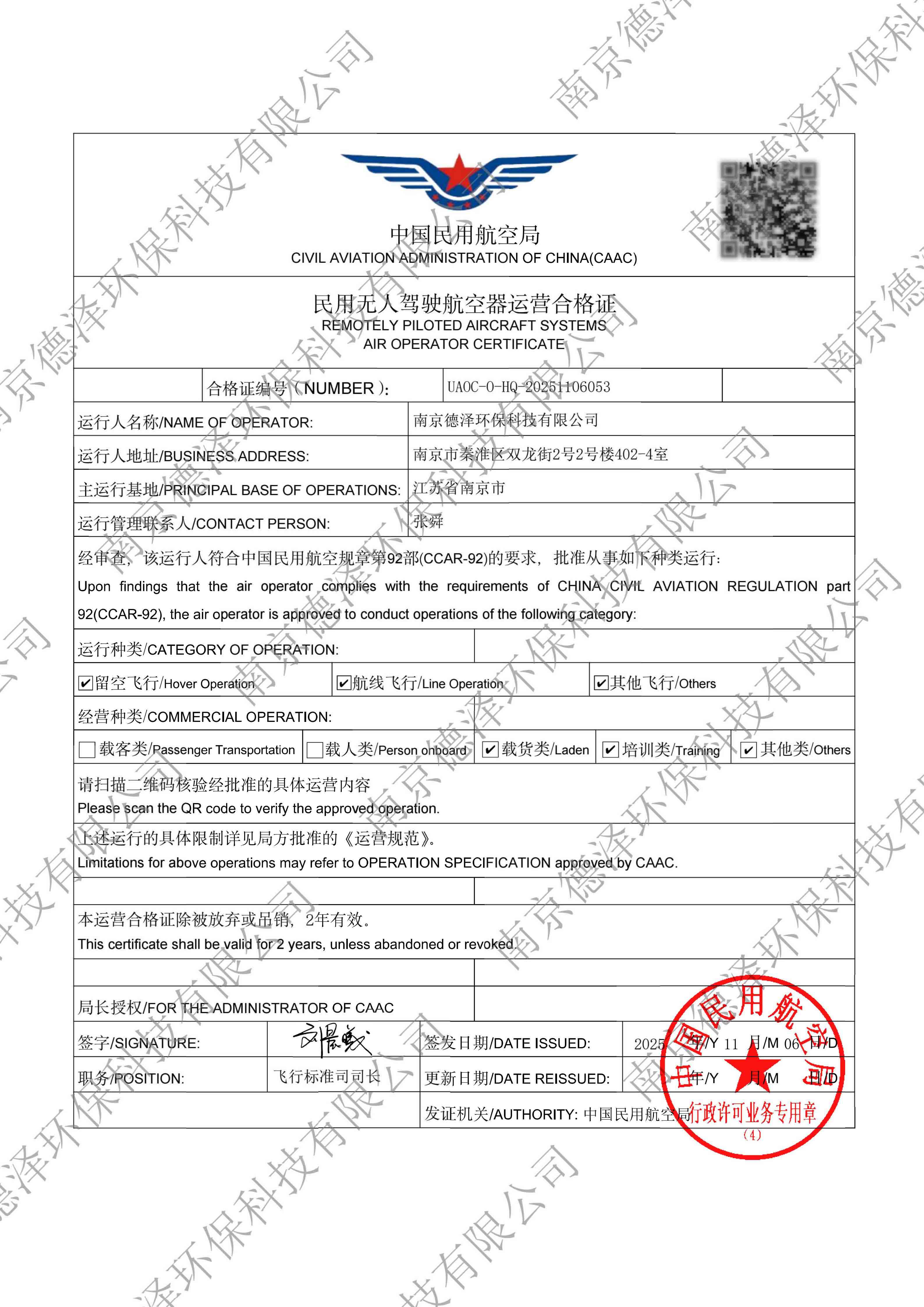 2025 年 11 月 6 日,南京德澤環(huán)??萍加邢薰境晒θ〉妹裼脽o人駕駛航空器運(yùn)營合格證。該證書由民航局頒發(fā),是企業(yè)合法開展商業(yè)飛行的核心資質(zhì),標(biāo)志著公司在無人機(jī)技術(shù)、安全管理等方面達(dá)到國家規(guī)范標(biāo)準(zhǔn)。