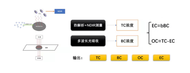 ACCM-1000系統(tǒng),主要由一臺(tái)TC-100總碳分析儀和一臺(tái)ACCM-1000碳質(zhì)組分監(jiān)測(cè)系統(tǒng)BC-100黑碳分析儀組成,TC-100總碳分析儀基于熱解析和NDIR原理,實(shí)現(xiàn)對(duì)氣溶膠中總碳(TC)濃度的測(cè)量,BC-100黑碳分析儀利用多波長(zhǎng)光吸收原理,實(shí)現(xiàn)氣溶膠中黑碳(BC)濃度的測(cè)量。ACCM-1000氣溶膠碳質(zhì)組分監(jiān)測(cè)系統(tǒng)根據(jù)總碳(TC)和黑碳(BC)濃度,可實(shí)現(xiàn)氣溶膠中有機(jī)碳(OC)和元素碳(EC)的在線監(jiān)測(cè)。