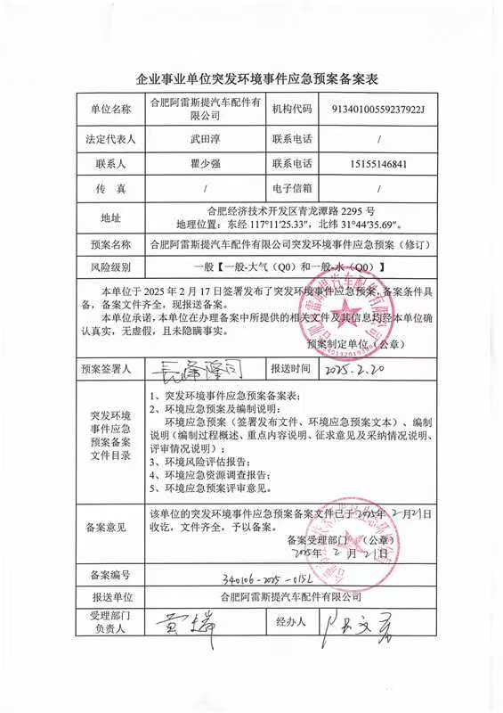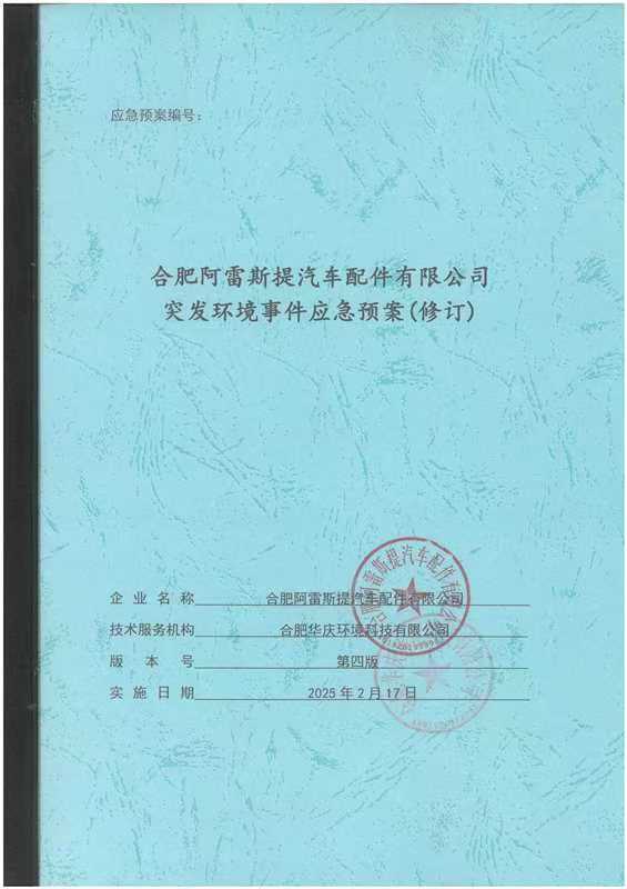 合肥阿雷斯提汽車配件有限公司突發(fā)環(huán)境事件應(yīng)急預(yù)案(終稿)